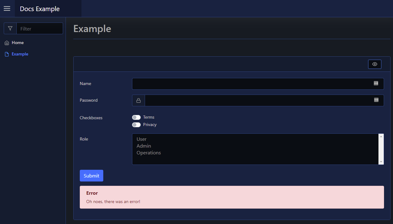 To create/show an error alert, such as when a form throws an unexpected error, you can use Out-PodeWebError. This will render an error alert beneath the element/sender that triggered the action (such as a a form, or a button). These errors will automatically be removed if the form is resubmitted.